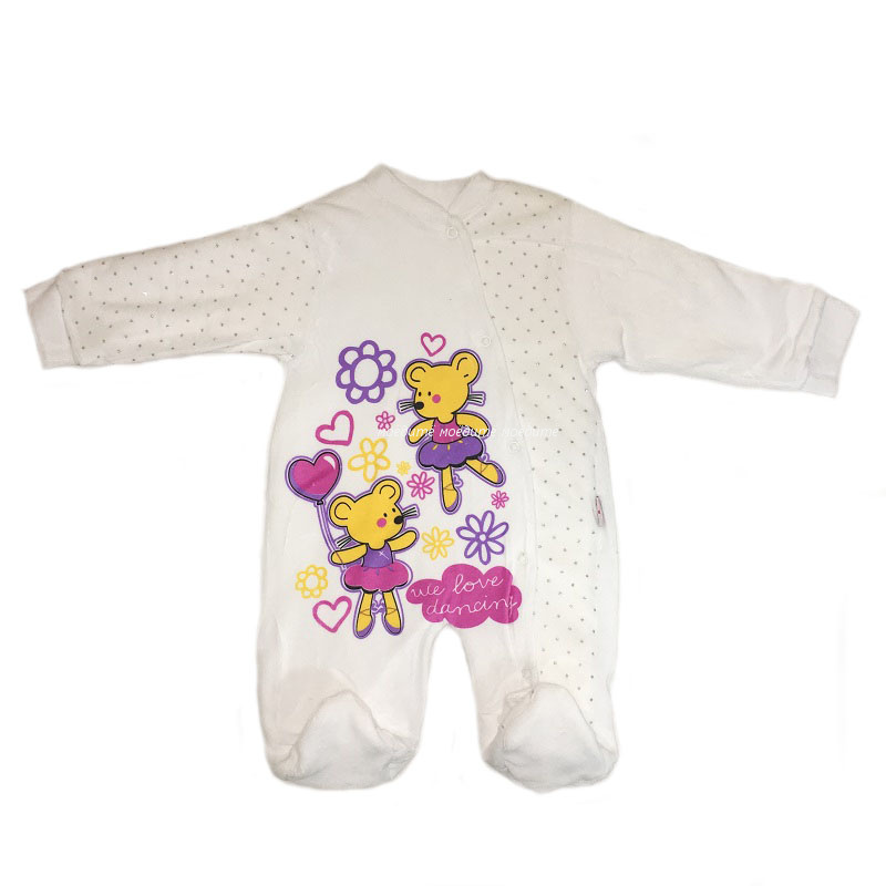 Комбинезон без капюшона, с закрытыми ножками, рукава на манжете, спереди на кнопочках от воротничка до конца ножки. Украшен спереди рисунком персонажей из мультиков.